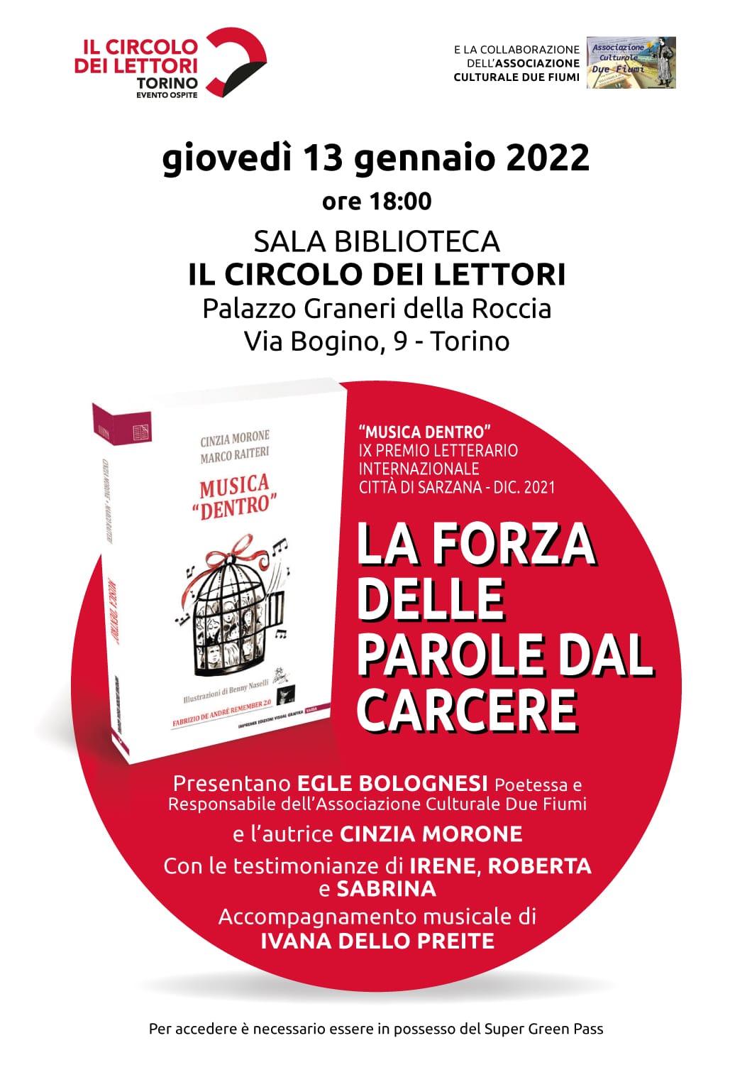 Nella Sala biblioteca del Circolo dei Lettori giunge finalmente la narrazione dell'esperienza, per musica e parola, di Marco Raiteri e Cinzia Morone. Un laboratorio che dal carcere femminile ha liberato pensieri e sogni, paure e speranze, in un corale viaggio introspettivo che sarà presentato da Egle Bolognesi, autrice della scuderia Impremix. Letture e suoni a cura di Ivana dello Preite, Irene, Roberta e Sabrina.