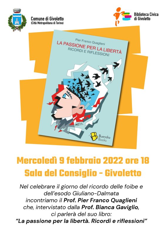 In occasione delle celebrazioni del giorno del ricordo delle foibe e dell’esodo Giuliano-Dalmata, mercoledì 9 febbraio alle 18 il Prof. Pier Franco Quaglieni presenterà il suo libro La passione per la libertà. Ricordi e riflessioni presso la Sala del Consiglio di Givoletto (TO)