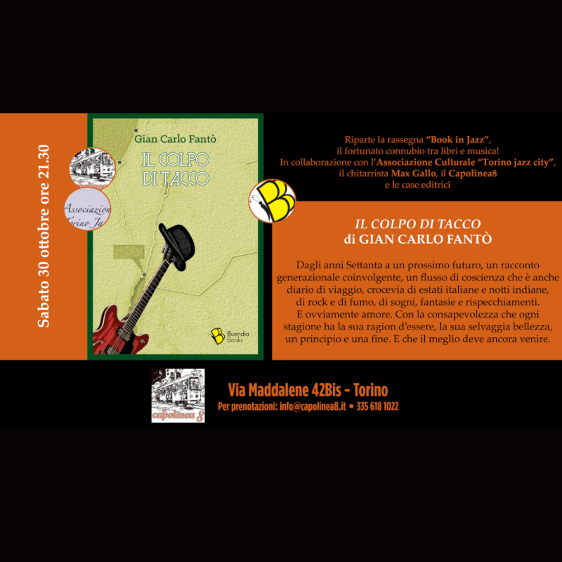 Riparte la rassegna “Book in Jazz”, il fortunato connubio tra libri e musica! In collaborazione con l’Associazione Culturale “Torino jazz city”, il chitarrista Max Gallo, il Capolinea8 e le case editrici. Gli incontri precederanno i concerti del sabato sera, con la possibilità per il pubblico di dialogare con gli autori e acquistare i libri.