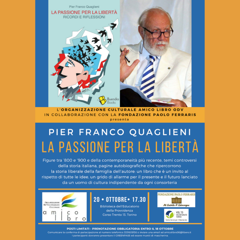 Mercoledì 20 ottobre alle ore 17.30 La passione per la libertà. Ricordi e riflessioni, il nuovo libro di Pier Franco Quaglieni, sarà presentato presso la Biblioteca dell'Educatorio della Provvidenza (corso Trento 13, Torino). L'evento è a cura dell'ORGANIZZAZIONE CULTURALE AMICO LIBRO ODV, in collaborazione con la FONDAZIONE PAOLO FERRARIS.