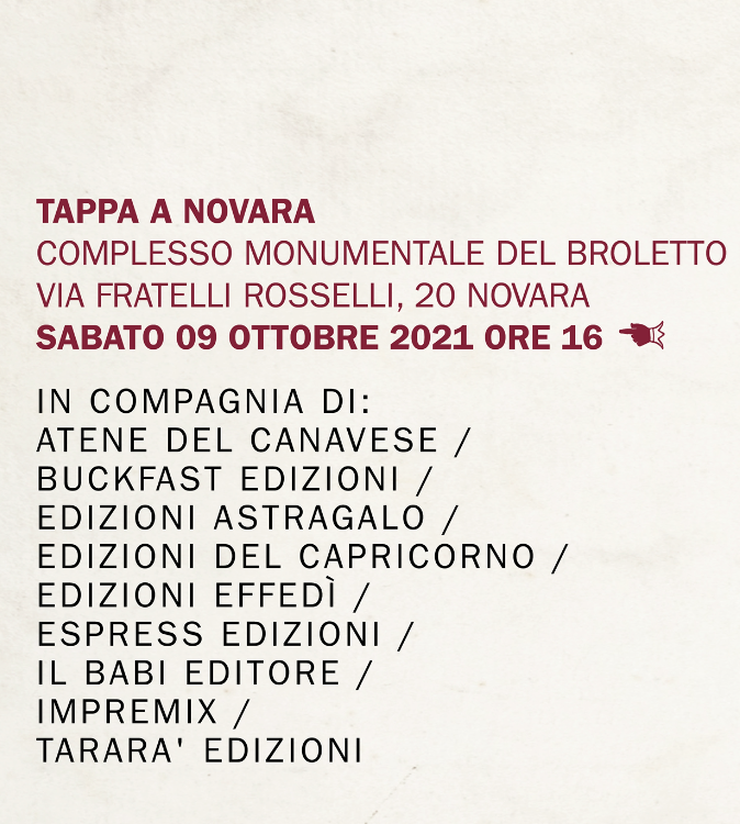 Sabato 9 ottobre 2021 alle ore 16 il viaggio tra le pagine dei libri made in Piemonte, ma di respiro non solo regionale, si ferma a Novara, con nove editori indipendenti piemontesi, i loro autori e gli organizzatori del Salone del Libro, per un appuntamento Complesso Monumentale del Broletto, sede del Circolo dei lettori di Novara, in via Fratelli Rosselli 20.