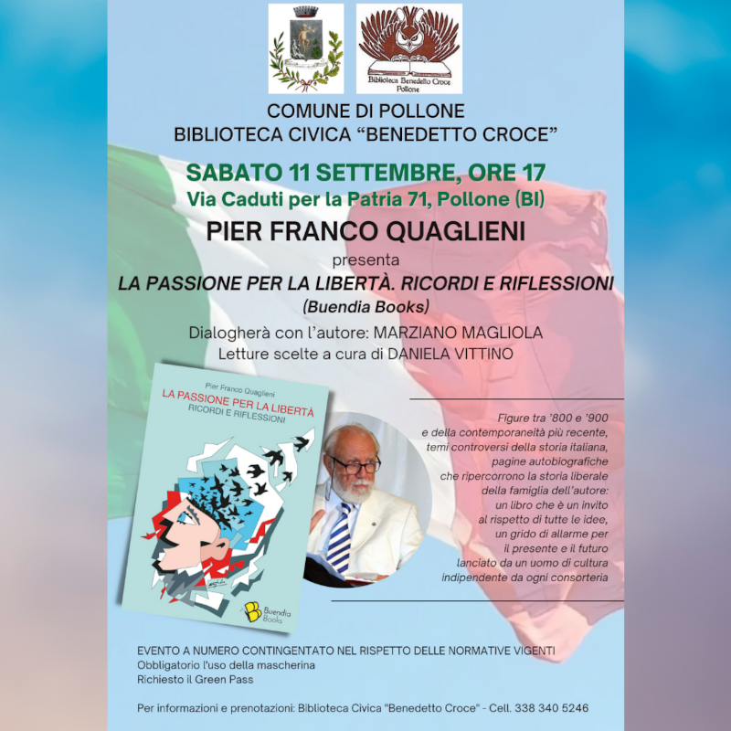 Sabato 11 settembre alle ore 17 La passione per la libertà. Ricordi e riflessioni, il nuovo libro di Pier Franco Quaglieni, sarà presentato a Pollone (BI), presso la Biblioteca Civica "Benedetto Croce".