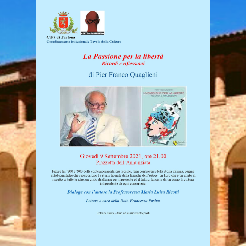Giovedì 9 settembre alle ore 21 La passione per la libertà. Ricordi e riflessioni, il nuovo libro di Pier Franco Quaglieni, sarà presentato a Tortona, presso la piazzetta dell'Annunziata.