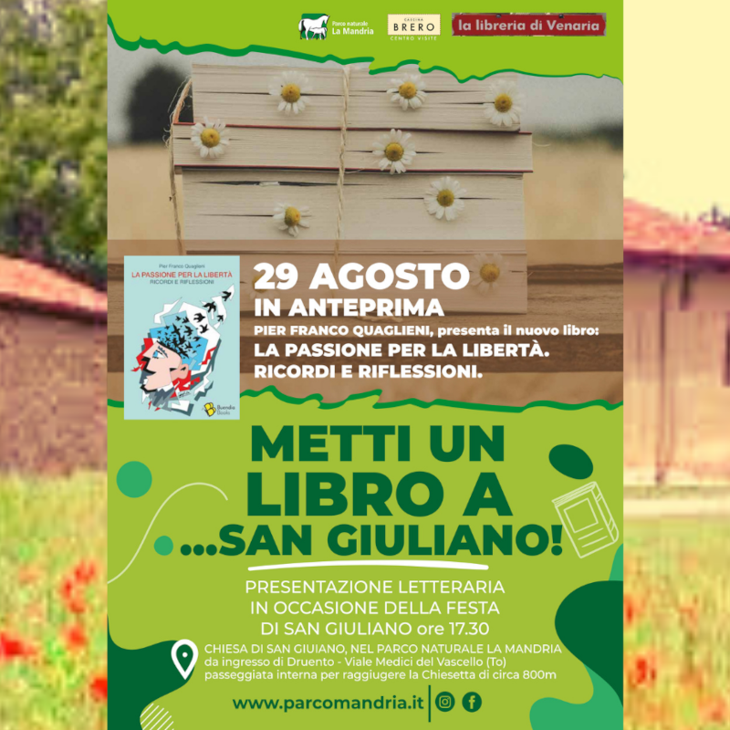 Domenica 29 agosto alle ore 17.30, in occasione della festa di San Giuliano, La passione per la libertà. Ricordi e riflessioni, il nuovo libro di Pier Franco Quaglieni, sarà presentato in anteprima nella CHIESA DI SAN GIULIANO, nel PARCO NATURALE LA MANDRIA (ingresso di Druento, viale Medici del Vascello)