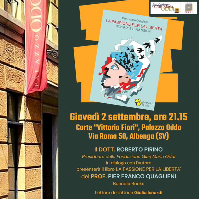 Giovedì 2 settembre alle 21.15 nella Corte "Vittorio Fiori" di Palazzo Oddo, in via Roma 54 ad Albenga, il medico-bibliofilo Roberto Pirino, presidente della Fondazione Oddi, presenterà il nuovo libro dello storico PIER FRANCO QUAGLIENI La passione per la libertà. Ricordi e riflessioni, un libro ricco di grandi figure e personalità (anche liguri come Alfredo Biondi) e di riflessioni storiche su pagine cruciali delle vicende italiane del secolo scorso.